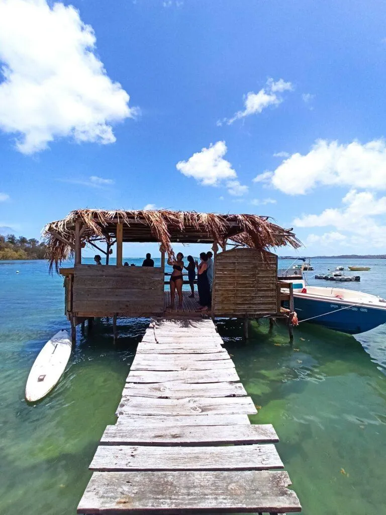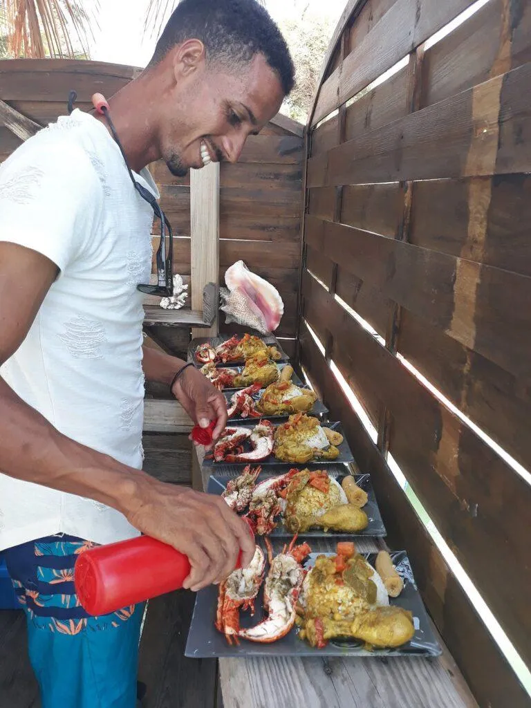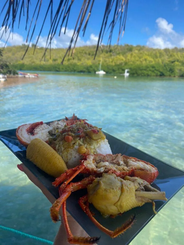Le repas se déroule dans une paillote sur l'eau, directement devant l'habitation d'Emmanuel Baur, créant une atmosphère conviviale et typiquement martiniquaise. La langouste servie provient de sa propre pêche, garantissant fraîcheur et qualité exceptionnelles.